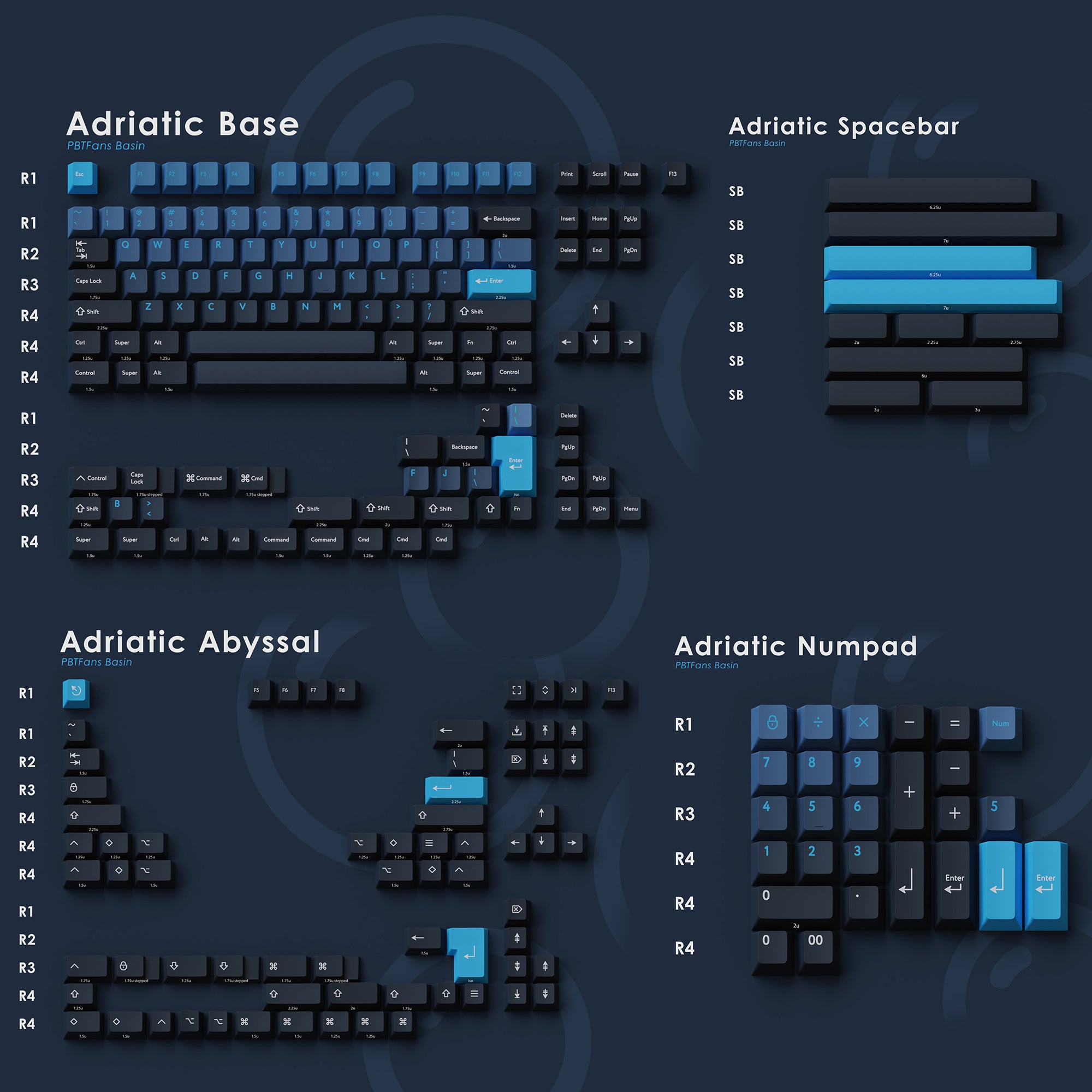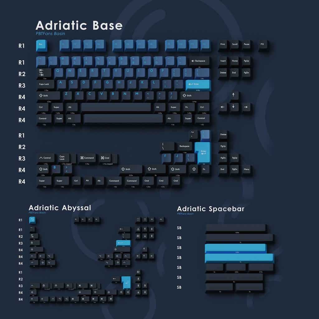 We designed this set to reflect the dynamic blue-grays of the ocean. Amidst the vastness of an oceanic basin are a wide variety of colors, and we have chosen a sinking gradient to portray diving into the depths of the ocean.
