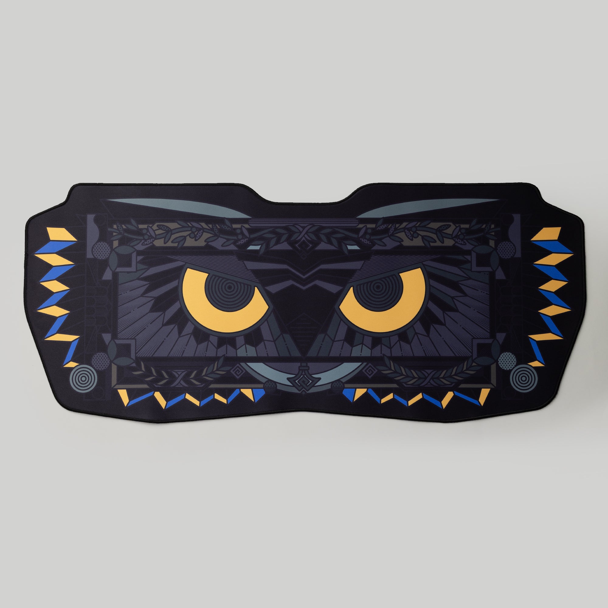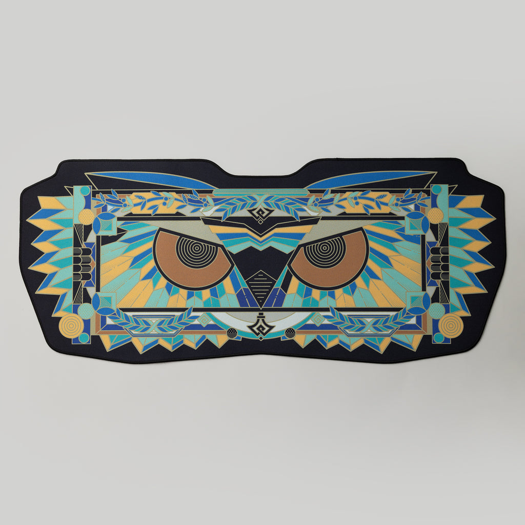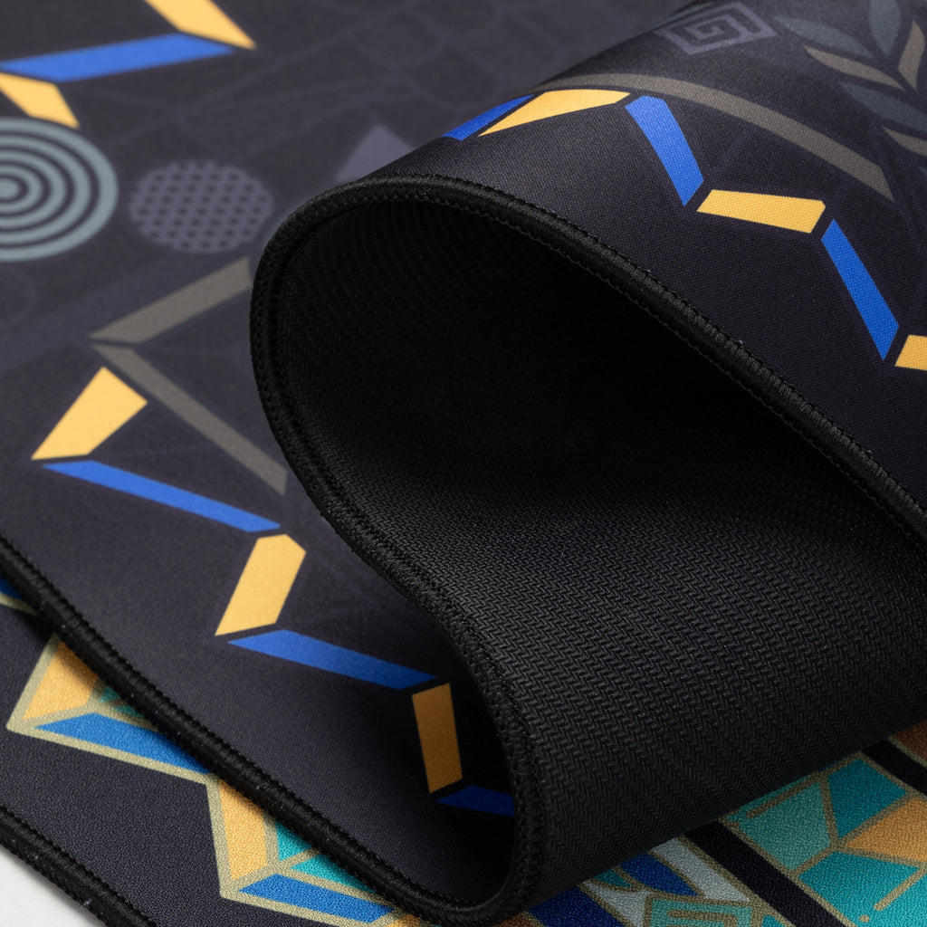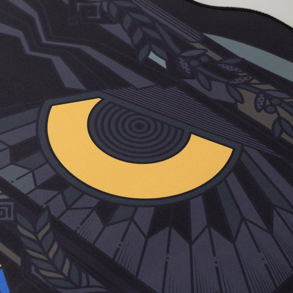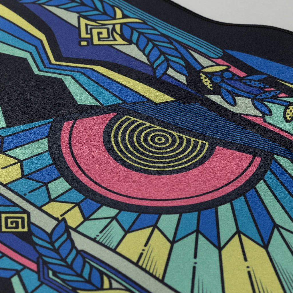 The Athena deskmat is inspired by the stained glass windows of Western churches, both of which are sacred and beautiful. The three colorways—Black, Green, and Blue—respectively symbolize the justice, wisdom, and peace that Athena represents.